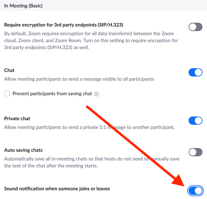 Una forma de minimizar las distracciones durante su reunión de Zoom es deshabilitar las notificaciones de entrada para los asistentes. No todos llegarán a tiempo y, dependiendo del tamaño de su equipo, escuchar ese timbre y ver la notificación de cada nueva entrada emergente no solo interrumpirá su proceso de presentación sino que también lo molestará.