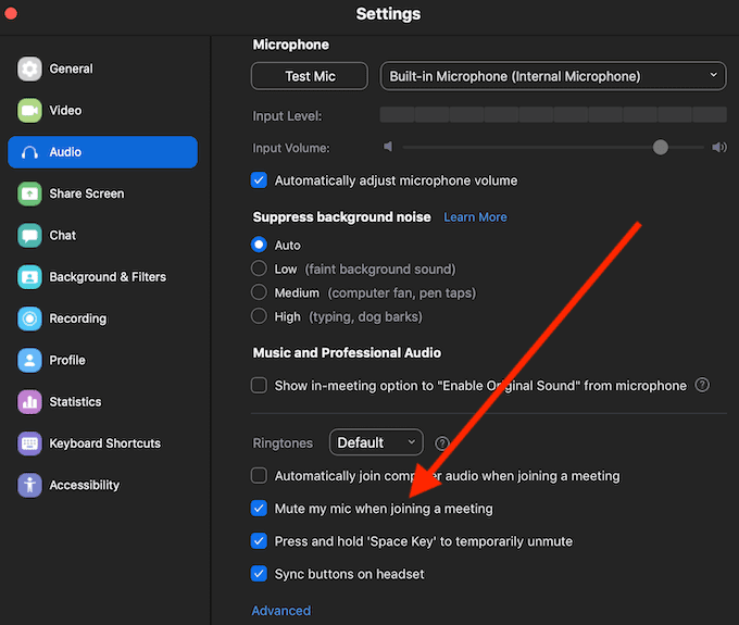 Puede silenciar su audio usando el atajo Alt + A (para Windows) o Cmd + Shift + A (para Mac ), o a través de la Configuración(Settings) de la aplicación Zoom siguiendo la ruta Configuración(Settings) > Audio > Silenciar mi micrófono al unirse a una reunión(Mute my mic when joining a meeting) .