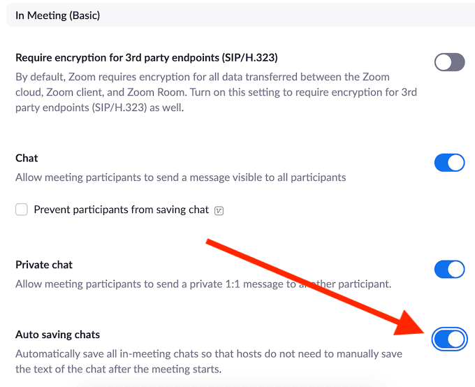Para hacerlo, vaya a la Configuración(Settings) de su cuenta de Zoom y siga la ruta Reunión(Meeting) > En reunión (Básico)(In Meeting (Basic)) > Guardado automático de chats(Auto saving chats) . Esto guardará automáticamente todos los mensajes en el chat, incluso los enviados en privado entre los asistentes.