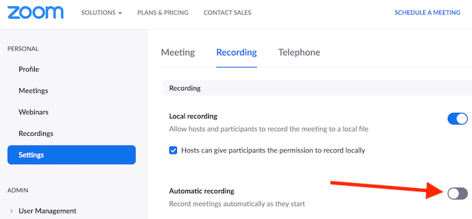 Si le preocupa olvidarse de grabar su reunión, puede ir a Configuración(Settings) de Zoom > Grabación(Recording) y habilitar la Grabación automática(Automatic recording) de sus reuniones de Zoom cuando comiencen.(Zoom)