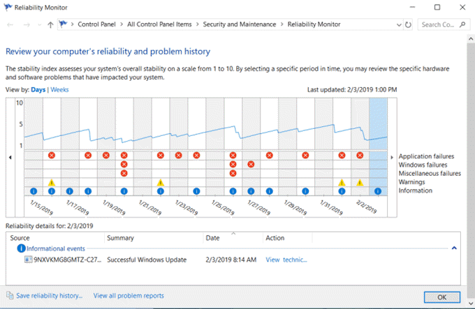 El gráfico del historial de confiabilidad le muestra dónde se han producido errores en su sistema Windows . Estos son los mismos errores que puede ver en los registros de eventos de Windows,(Windows Event Logs) pero presentados de forma gráfica donde los errores son fáciles de detectar.
