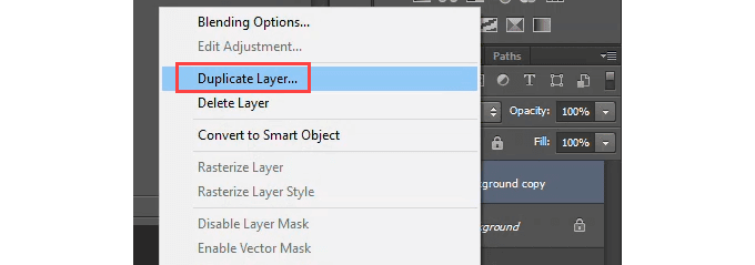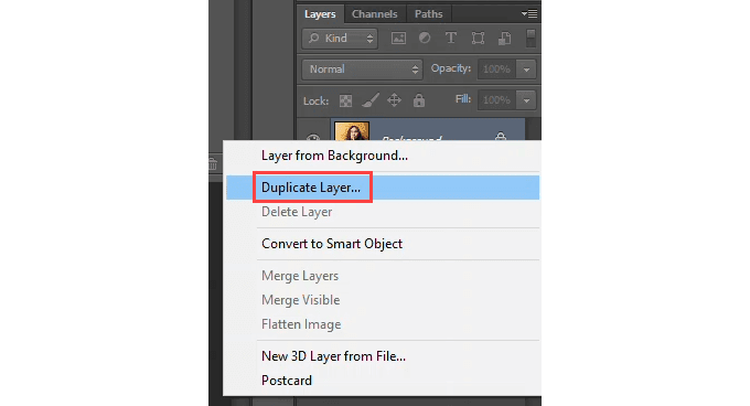 - Cree una copia de la capa de fondo haciendo clic derecho en la capa y seleccionando Duplicar capa(Duplicar capa) .