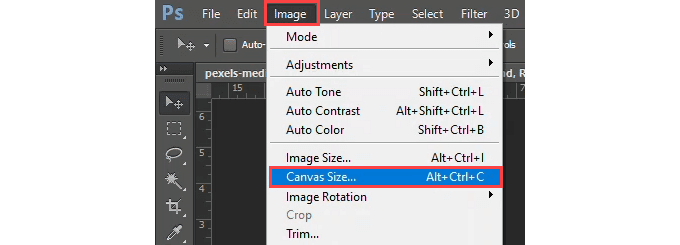 - Seleccione la imagen de fondo original y seleccione Imagen(Imagen) > Modo(modo) > Tamaño lienzo(Tamaño del lienzo) o presione alternativa + tecla de control + C.