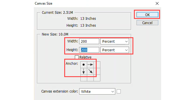- Cambia las unidades a Porcentaje(por ciento) y hacer Ancho(ancho) y Más alto es 200 por ciento(Altura 200 por ciento) . Ancla(Ancla ) la imagen en la esquina superior izquierda. Elegir Aceptar(ESTÁ BIEN) .