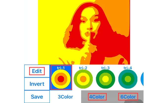 - Inmediatamente la imagen cambia a algo como esto arte pop . Pruebe círculos de diferentes colores marcados como tri-1 , tri2 ambas cosas tri3 . Elegir 4 colores ambas cosas 6 colores para una mayor profundidad de color. seleccione el botón Editar(Editar) hacer aún más.