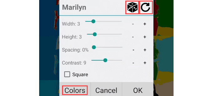 Juega con estas configuraciones hasta que obtengas algo que te guste. icono dado(Él dice ) ofrece configuraciones aleatorias. Icono flecha redonda(flecha redonda) deshacer el último cambio. Elegir Colorante(Colores) le permite cambiar la paleta.