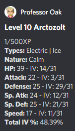 Cuando se captura, cada Pokémon arroja un nivel y IV(level and IVs) , o valores individuales(Individual Values) , que ayudan a determinar su nivel de poder y valor(power level and value) general (para el intercambio). Esto hace que la economía del bot sea mucho más profunda que simplemente atrapar el Pokémon que un jugador puede querer: atrapar uno con IVs perfectos es el objetivo final. El nivel de cada Pokémon aumenta pasivamente a medida que los jugadores chatean en los servidores de Discord que cuentan con el bot.