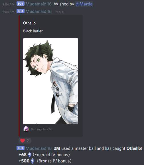 Mudae reúne personajes de anime y juegos y es especialmente bueno en servidores más pequeños debido a su sistema de generación finito(finite spawning system) .