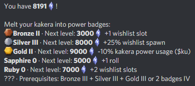 Mudae también cuenta con un sistema de moneda(currency system) profundo , kakera, que permite a los jugadores subir de nivel insignias que aumentan la forma en que experimentan el juego. Por ejemplo, los jugadores pueden usar su kakera para forjar una insignia de bronce(Bronze badge) que les dará un espacio adicional en la lista de deseos(wishlist slot) , que les avisará cuando se haya obtenido el personaje que desean.