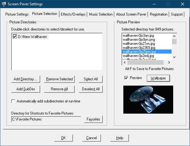 Hablando de selección de imágenes(picture selection) , ScreenPaver tiene un sistema bastante robusto para elegir de qué directorios dibujas tus fotos. Puede extraerlos de varias unidades, seleccionar subcarpetas e incluso marcar ciertas imágenes dentro de una carpeta como favoritas. No tiene tantas transiciones como algunos protectores de pantalla de presentación de diapositivas, pero es dudoso que a muchas personas les preocupe tener solo unas pocas docenas(dozen transition) de efectos de transición en lugar de cientos de ellos.