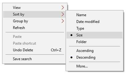 Cuando aparezcan los resultados de la búsqueda, haga clic con el botón derecho en cualquier lugar en blanco y seleccione Ordenar por(Sort by) seguido de Tamaño(Size) y Descendente(Descending) . Esto asegurará que el archivo más grande se muestre en la parte superior de los resultados.