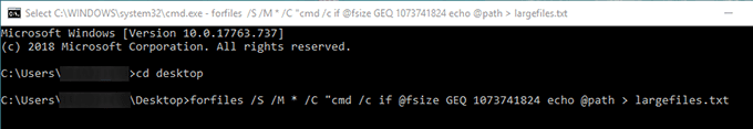 forfiles /S /M * /C “cmd /c if @fsize GEQ 1073741824 echo @path > largefiles.txt