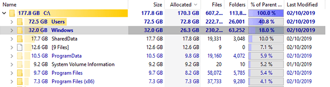 - Verá un árbol de sus carpetas junto con el espacio que ocupan en su pantalla. Puede hacer doble clic en cualquier carpeta para ver sus subcarpetas y sus tamaños.