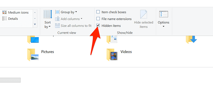 - Para volver a ocultar sus elementos, anule la selección de la casilla Elementos ocultos(Hidden items) en el Explorador de archivos.