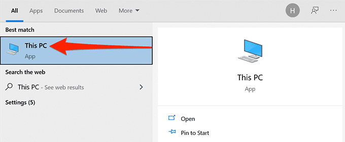 - Abra el menú Inicio(Start) , busque Esta PC(This PC) y seleccione Esta PC(This PC) en los resultados de búsqueda.