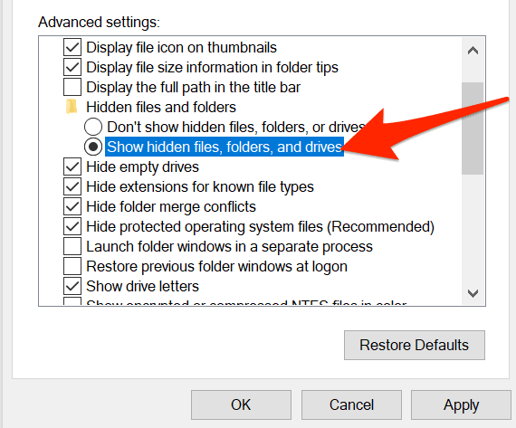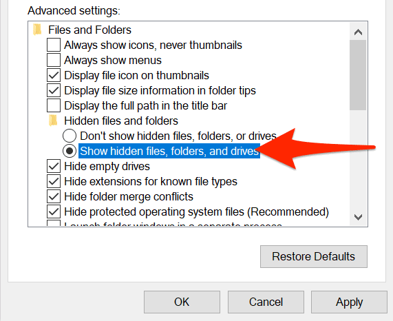 - Active la opción Mostrar archivos, carpetas y unidades ocultos . (Show hidden files, folders, and drives)Luego, seleccione Aplicar(Apply) y seleccione Aceptar(OK) para guardar su configuración.