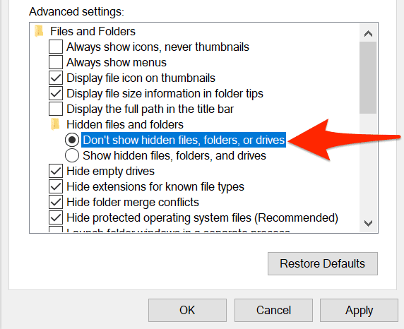 - Para ocultar elementos ocultos, seleccione la opción No mostrar archivos, carpetas o unidades ocultos . (Don’t show hidden files, folders, or drives)Luego, seleccione Aplicar(Apply) seguido de Aceptar(OK) .