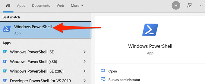 - Haga clic(Click) en Inicio(Start) o en el ícono de Windows(Windows Icon) en la parte inferior izquierda y escriba PowerShell. Seleccione Windows PowerShell de los resultados.