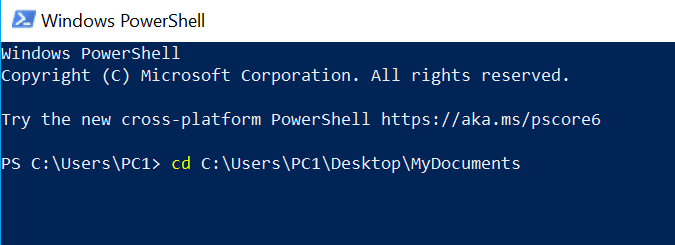 - En la ventana de PowerShell, escriba cd , escriba un espacio y luego ingrese la ruta completa de la carpeta donde se encuentran sus archivos ocultos. Por ejemplo, si sus archivos ocultos están en una carpeta llamada Mis documentos(MyDocuments) en su escritorio(desktop) , usaría el siguiente comando reemplazando USUARIO(USER) con su nombre de usuario. Luego, presione Entrar(Enter) .