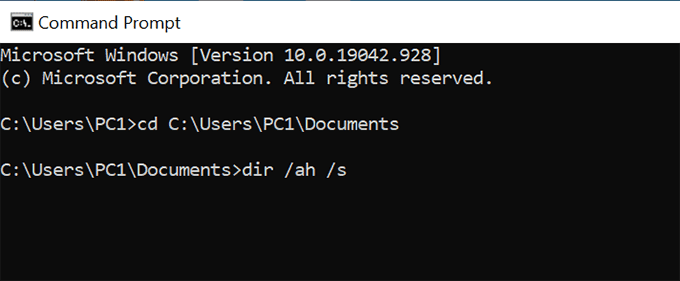 - Escriba dir /ah para ver una lista de los archivos y carpetas ocultos.