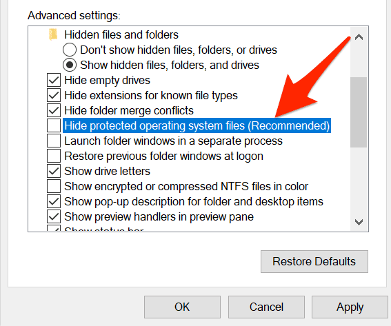 - Desplácese hacia abajo hasta Ocultar archivos protegidos del sistema operativo (recomendado)(Hide protected operating system files (Recommended)) . Desmarque la casilla de esta opción.