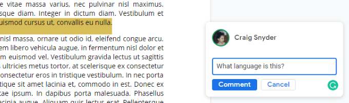 ¡Es tan simple! Su documento ahora resaltará el texto que comentó. Su comentario se mostrará en el lado derecho del documento, pero al hacer clic en el área de texto resaltada, su atención se centrará en el comentario y se mostrarán las opciones de las que hablaremos a continuación.