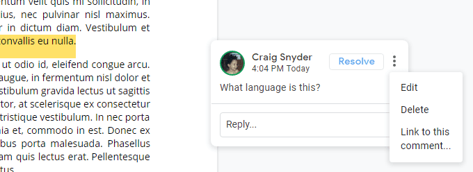 Puedes hacer clic en un comentario a la derecha. documento o haga clic(documento o clic) en la parte resaltada del texto del documento para colocar el comentario en primer plano. Mientras esté en primer plano, tendrá la opción de responder o resolver el comentario. Si tiene permisos, también puede editarlos o eliminarlos.