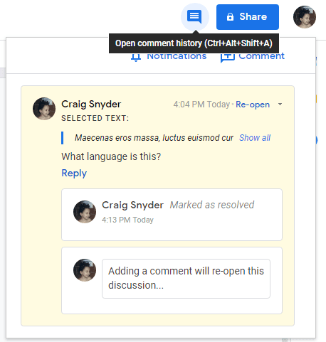 Resolver comentarios también les da a otros colaboradores la oportunidad de reabrir la discusión si sienten que se necesita hacer más o que sin comentarios(el comentario no fue) fue resuelto Otra vez(otra vez) simplemente eliminar un comentario cuando cree que se ha resuelto no compartirá esas opciones con otros, y no iniciará sesión en historial de comentarios(historial de comentarios) Tu documento.