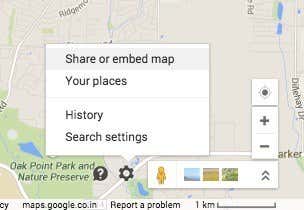 Entonces, ¿cómo hacemos para crear este cuadro modificado para obtener direcciones? Bueno(Well) , primero, necesitaremos obtener la sintaxis correcta para la URL que Google usa para las direcciones. Afortunadamente, podemos averiguarlo obteniendo direcciones entre dos lugares y luego simplemente copiando la URL de la barra de direcciones(address bar) . También puede hacer clic en el pequeño icono de engranaje en la parte inferior derecha de la página y elegir Compartir o incrustar mapa(Share or embed map) .