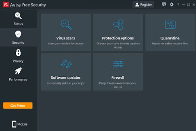 – La interfaz principal de Avira Free Security para Windows consta de cuatro iconos principales en la barra lateral de la derecha: Expresar, Seguridad, Privacidad Esto es Actuación.