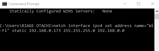 En nuestro ejemplo, este comando se vería así: netsh interfaz ipv4 establecer nombre de dirección = «Wi-Fi» estático 192.168.0.173 255.255.255.0 192.168.0.0