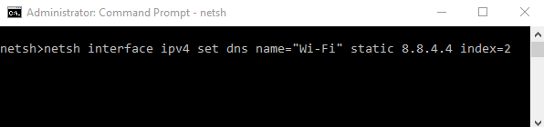 - Luego escriba el comando netsh interface ipv4 set dns name = «SU INTERFAZ» static DNS_SERVER index = 2 secundario. Otra vez(otra vez) usaremos un servidor secundario Google público como ejemplo de 8.8.8.8 que se verá así: netsh interface ipv4 set dns name = ”Wi-Fi” static 8.8.4.4 index = 2.