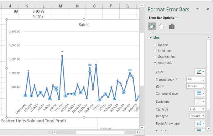 Estos incluyen cambiar el tipo y el color de la línea de la barra de error(error bar line type and color) , la transparencia y el ancho(transparency and width) , y mucho más. La mayoría de las personas dejan esta configuración como predeterminada, pero sepa que están disponibles si desea ajustar cómo se muestran las barras de error en su gráfico.