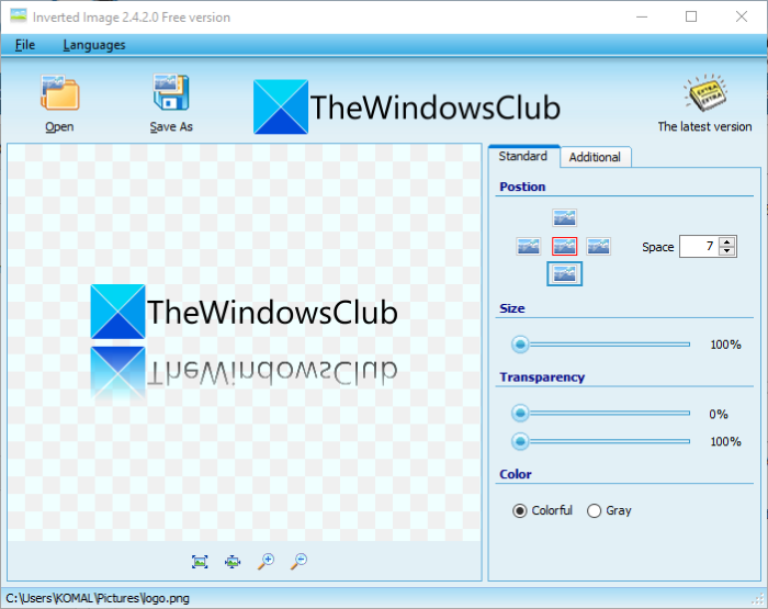 Ahora podrá ver la imagen con un efecto de espejo predeterminado en la interfaz principal. Simplemente(Simply) configure varias opciones para personalizar el efecto de espejo, como la posición del efecto(mirror effect position) de espejo (arriba, abajo, izquierda o derecha), el tamaño del efecto(size of the effect) , la transparencia( transparency) y el color del efecto(effect color) (colorido o gris). Estos parámetros se pueden configurar desde la pestaña Estándar . (Standard)Si desea personalizar más opciones relacionadas con el efecto de espejo, vaya a la pestaña Adicional( Additional) y configure los parámetros, incluido el color de relleno de fondo(background fill color) , el canal alfa(alpha channel) y agregar onda(add wave) .