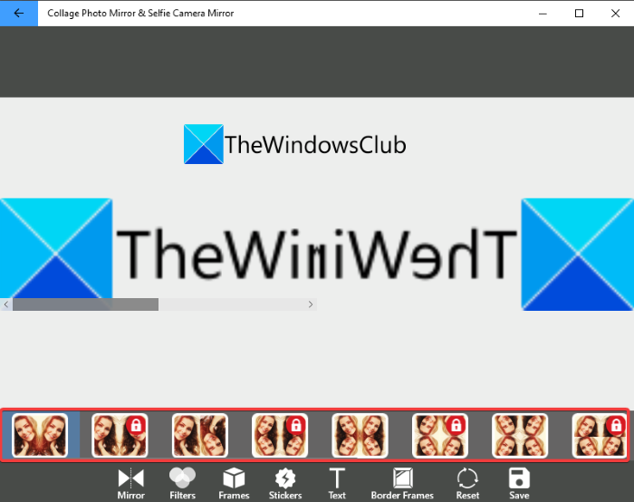 A continuación, mostrará la imagen con un reflejo de espejo predeterminado. Luego puede seleccionar el tipo de efecto de espejo que desea agregar a su imagen haciendo clic en la opción Espejo . (Mirror)Además, también puede agregar filtros, marcos, pegatinas, marcos de borde(filters, frames, stickers, border frames,) y texto(text) a sus fotos según sus necesidades.