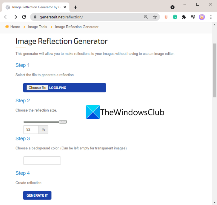 También puede usar servicios web gratuitos para agregar efectos de reflejo de espejo a sus fotos. Hay varios sitios web en línea que le permiten hacerlo. Aquí, vamos a utilizar este servicio en línea llamado generateit.net para agregar efectos de espejo a las imágenes.