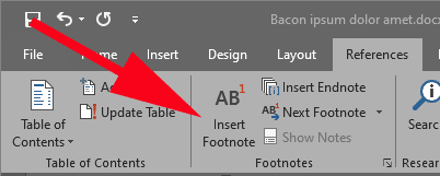 - A continuación, en la pestaña Referencias de la cinta de opciones de la barra de herramientas, seleccione (References )Insertar nota(Insert Footnote) al pie .