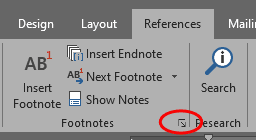 Para personalizar el formato y otros aspectos de las notas al pie, seleccione Referencias(References) y la flecha emergente(popout arrow) en la sección Notas(Footnotes) al pie de la barra de herramientas.