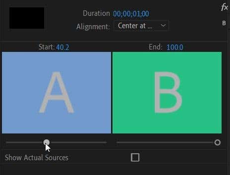 - Puede cambiar el lugar donde comienza la transición yendo a la barra de abajo cuadrado(Lugar) Y. haga clic aquí(Hacer clic) y arrastre el pequeño círculo para cambiar el valor Comienzo(Comienzo) . Esto hará que la transición comience más cerca o más lejos del comienzo del segundo clip. Para cambiar el punto final de la transición, use la barra de abajo cuadrado(cuadrado B) b.