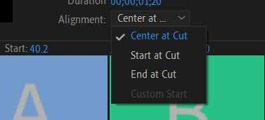 - También puede alinear rápidamente una transición para que comience donde se cortan los clips. Ir al menú desplegable Alineación(alineación) y seleccione dónde desea comenzar o finalizar la transición según el corte.