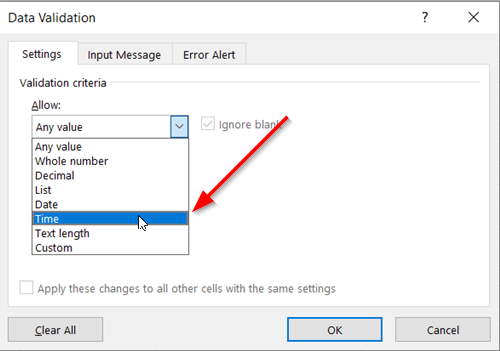 Cuando se abre la ventana Validación de datos(Validación de datos) verás algunas luces. Puede asegurarse de que solo se agreguen números o una longitud específica de texto, como un número de teléfono.