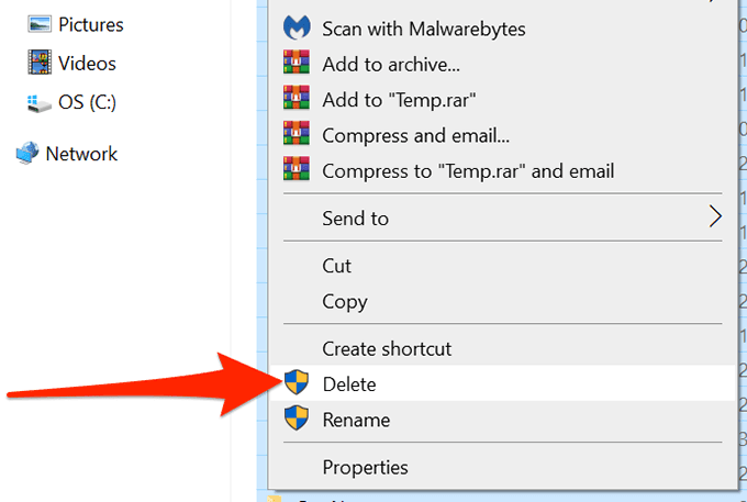 - Haga clic con el botón derecho en cualquier archivo y seleccione Eliminar(Delete) . Esto elimina todos sus archivos temporales.