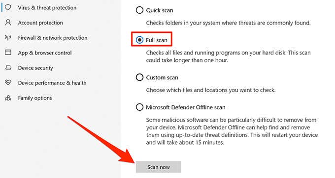 - Elija la opción Escaneo completo y seleccione (Full scan)Escanear ahora(Scan now) en la parte inferior.