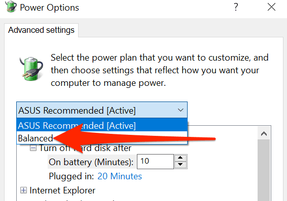 7. Haga clic en el menú desplegable en la parte superior y recorra las otras opciones con un reinicio de PC entre cada selección. Por ejemplo, si este menú tiene Equilibrado(Balanced ) como la selección actual, cámbielo a una de las otras opciones disponibles. Seleccione Aplicar(Apply) o Aceptar(OK ) en la parte inferior para guardar los cambios. Reinicie la PC.