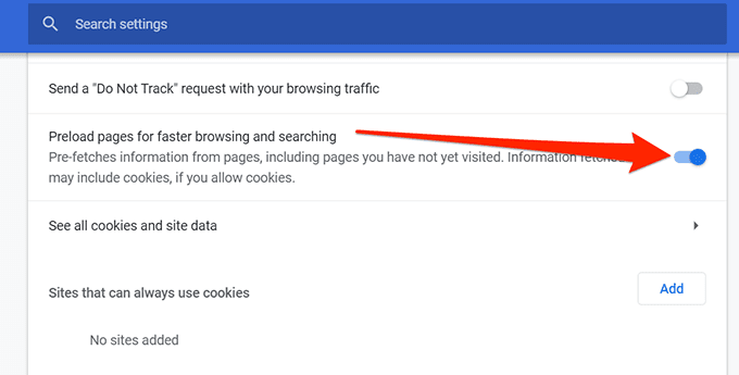 - Desplácese hacia abajo y deshabilite las páginas precargadas para navegar y buscar más rápido(Preload pages for faster browsing and searching) .