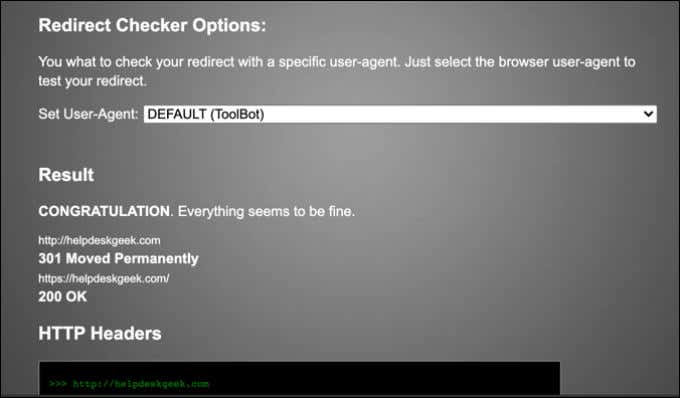 Si se pregunta si un servidor web tiene la culpa, puede usar un sitio como Redirect Checker para verificar su estado. Sitios como Redirect Checker identificarán la cantidad de redireccionamientos realizados por un servidor cuando se carga una página. Si el número de redireccionamientos es excesivo, la falla está basada en el servidor y no puede resolverla.