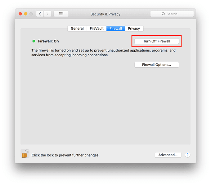 - Haga clic en Desactivar cortafuegos(Turn Off Firewall) para desactivar el cortafuegos en su Mac .