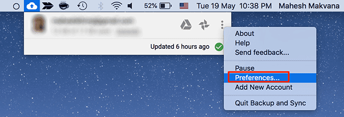 - Haga clic en el icono Copia de seguridad y sincronización(Backup and Sync) en la barra de menú, seleccione los tres puntos y elija Preferencias(Preferences) .