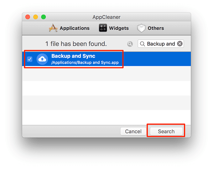 - Inicie AppCleaner , busque Backup and Sync , selecciónelo y haga clic en Buscar(Search) .