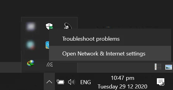 - Haz clic con el botón derecho en el icono de red en la bandeja del sistema y selecciona Abrir configuración de red e Internet.